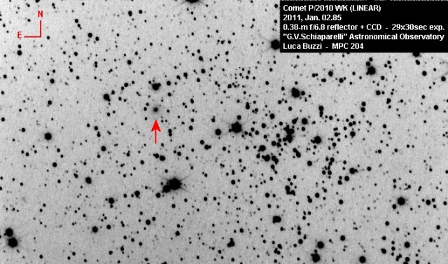 P/2010 WK (LINEAR) has no tail, but a round coma 30″ wide. Its strong central condensation has a FWHM of 4.4″, compared to 3.1″ of stars:
