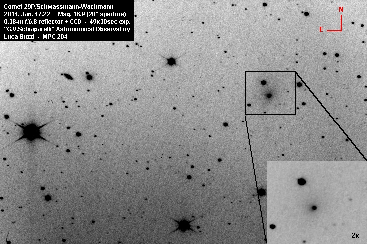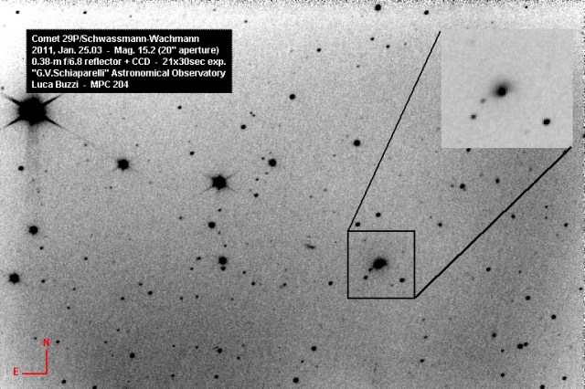 Discovered on 1927, Nov. 15 by Arnold Schwassmann and Arno Arthur Wachmann from Hamburg Observatory, Bergedorf, Germany, this comet is well known in the astronomical comunity for its periodic (although not regular) outbursts.