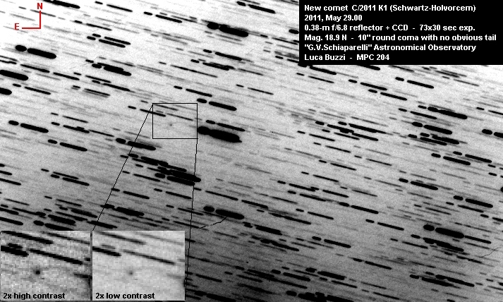 C/2011 K1 (Schwartz-Holvorcem) was discovered on 2011, May 26.25 by M. Schwartz and P. Holvorcem with the 0.41-m f/3.75 astrograph + CCD from Tenagra Observatory, Arizona, USA.