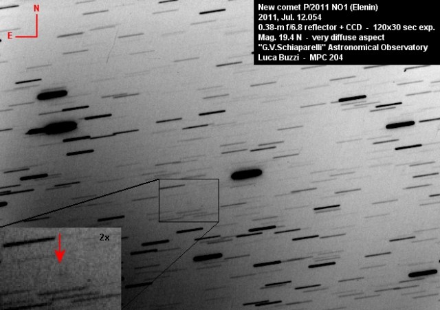 P/2011 N01 was discovered on 2011, Jul. 07.30 by Leonid Elenin and I. Molotov on four 240-s exp. taken with a 0.45-m f/2.8 reflector + CCD from their remote ISON-NM Observatory, New Mexico, USA.