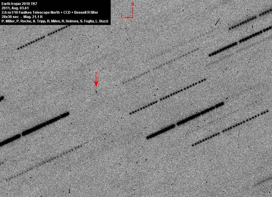 2010 TK7 was originally discovered by NASA WISE survey on 2010, Oct. 01, then placed on the MPC NEO Confirmation Page, allowing astronomers to obtain some follow-up. It was observed for a 6-days arc, then recovered by Christian Veillet et al. using Canada-France-Hawaii Telescope on 2011 April 28-29, when it was at mag. 23.2 r.