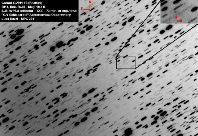 C/2011 Y3 (Boattini) was discovered by Andrea Boattini on 2011, Dec. 25.24 with the 1.5-m f/2 reflector + CCD from Mount Lemmon Sky Survey (part of the Catalina Sky Survey). He described the comet as being very diffuse with central condensation: four 30-s exposures show a 6″ coma and a wide fan-shaped tail about 30″ long in p.a. 240-245 deg.