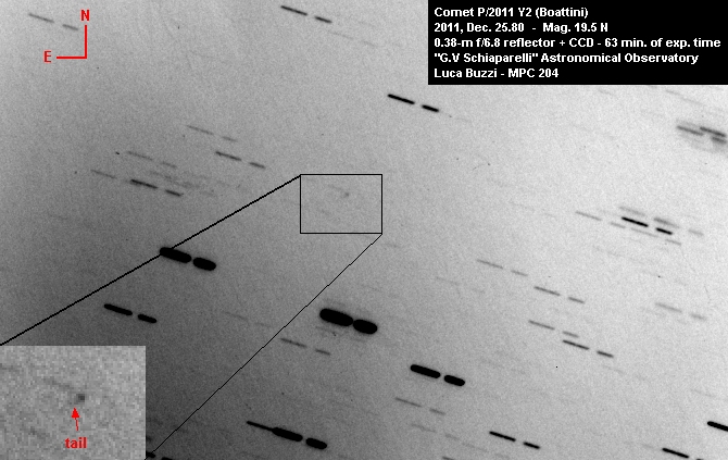 P/2011 Y2 (Boattini) was discovered by Andrea Boattini on 2011, Dec. 24.12 with the 1.5-m f/2 reflector + CCD from Mount Lemmon Sky Survey (part of the Catalina Sky Survey). He described the comet as having a very condensed 5″ coma and no sign of a tail in 3″ seeing.