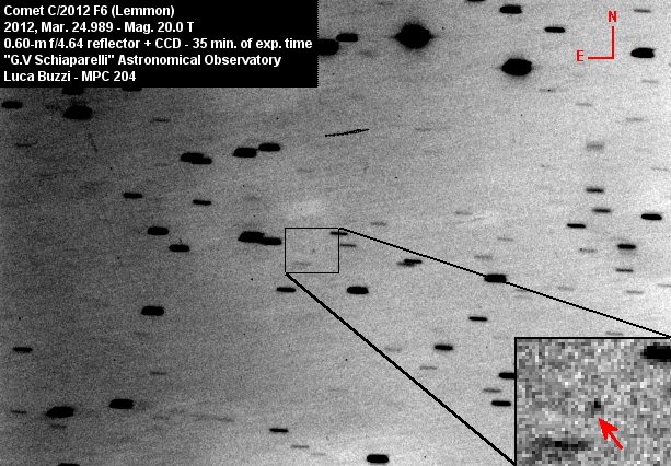 P/2012 F6 was also discovered by Alex Gibbs the following night with the same telescope, but it was officially named Lemmon because he did not recognize its cometary appearance. It was in fact placed on the NEO Confirmation Page as an asteroid.