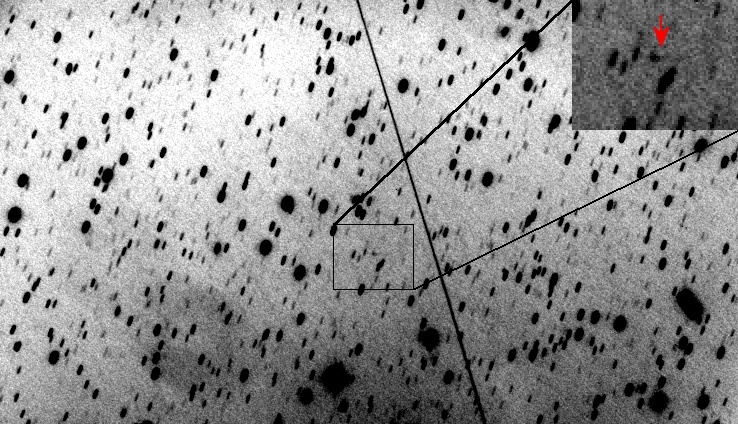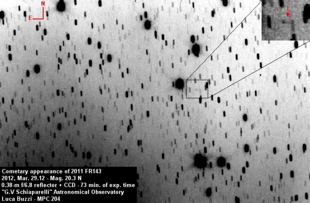 Thanks to Sergio Foglia, who alerted me about this particular target, we successfully recovered it at mag. 20.3 R on 2012, Mar. 29 (exactly one year after its original discovery!). Stacking all images together (73 minutes of total exposure time) we noted its cometary appearance, with a 6″ coma and a tail 10″ in PA around 270°.