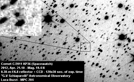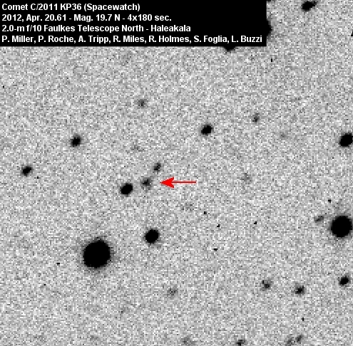 During observations of NEO 1998 OK1 with the 0.81-m f/4 of ARI Observatory (Westfield, code H21) on Apr. 19 Tomas Vorobjov serendipitously detected also 2011 KP36 in the same FOV. Stacking all the images together (totalling 30 minutes) with its proper motion vector, Tomas Vorobjov firstly noted its cometary appearance, with a coma 6″ wide and a possible tail 9″ long in PA around 10°. Its FWHM was 4.4″ while stars nearby were 3.5″. Here is an animation from two cropped stacks (30×30 seconds each):