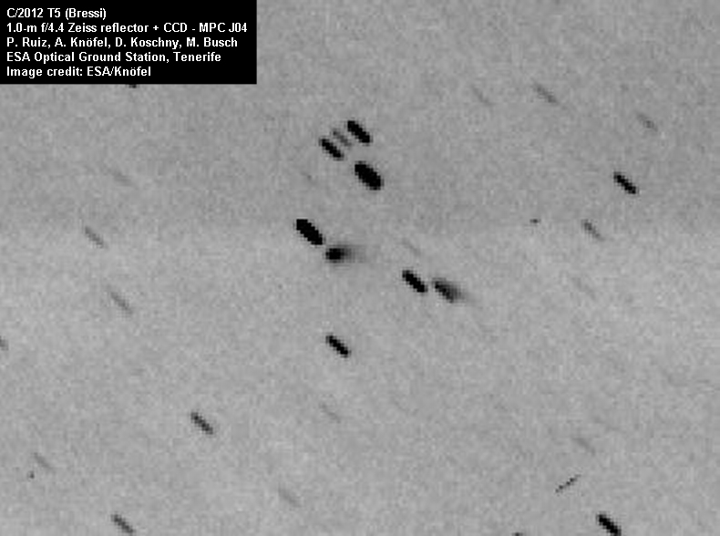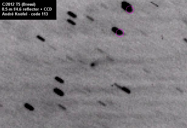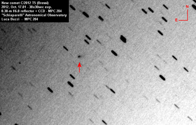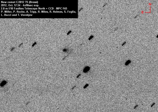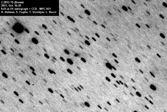 C/2012 T5 (Bressi) was discovered by Terry Bressi, Spacewatch survey, on images taken with the 0.9-m f/3 reflector telescope from Kitt Peak, on Oct. 14.4. She noted the object to be diffuse with an apparent faint tail about 9″ long in PA 260°, and she obtained confirmation images with the 1.8-m f/2.7 reflector (diffuse with a broad tail extending about 10″ in PA about 270 deg).