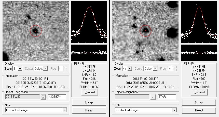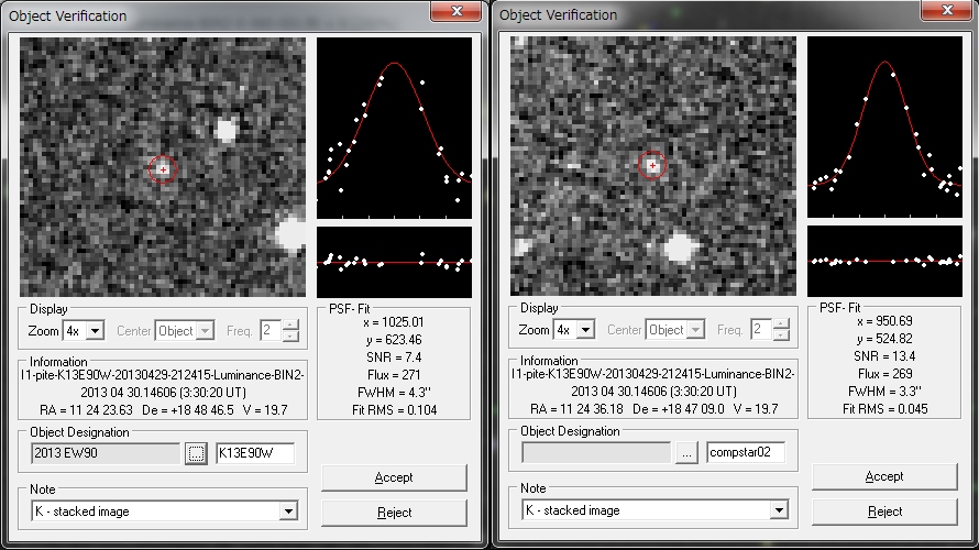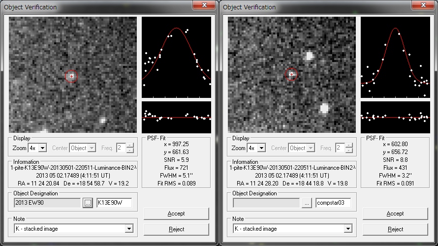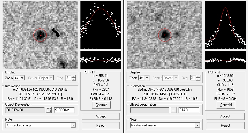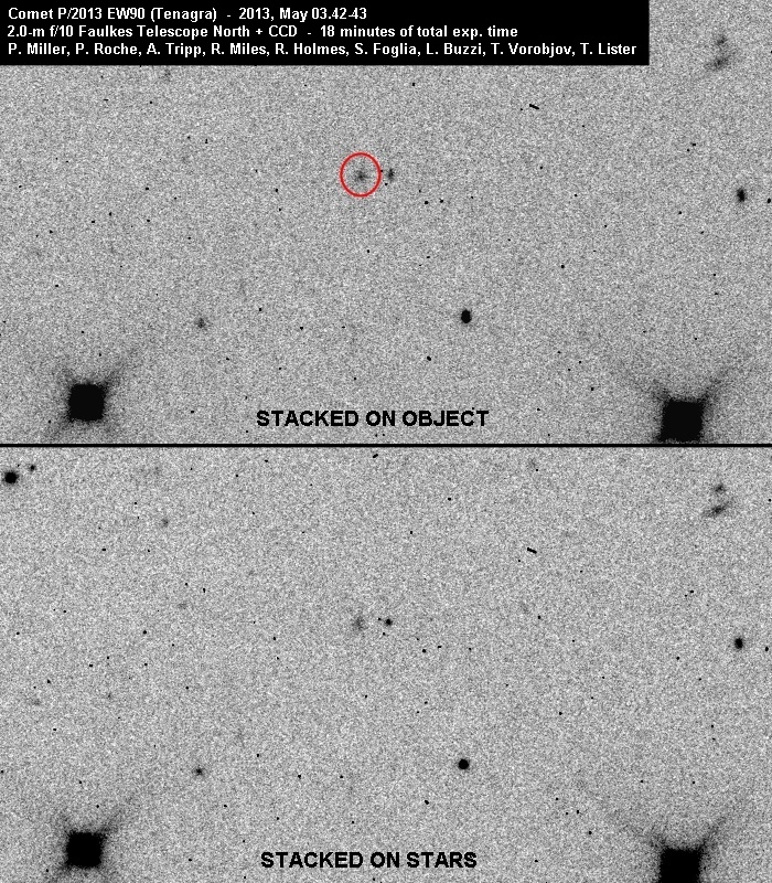 L. Buzzi obtained two night of observations from Schiaparelli Observatory (MPC 204) with a 0.60-m f/4.64 reflector. On the first night (May. 04.90-92) a stack of images totalling 43 minutes of exposure time, 2013 EW90 appears clearly softer respect to stars, with a FWHM about 25% larger and a round 11-12″ coma. On the second night (May. 06.85-89) a stack of images totalling 48 minutes of exposure time in slightly better seeing, the object appears again softer respect to stars, with a FWHM 15-20% larger than stars nearby and a 9″ coma with no tail.