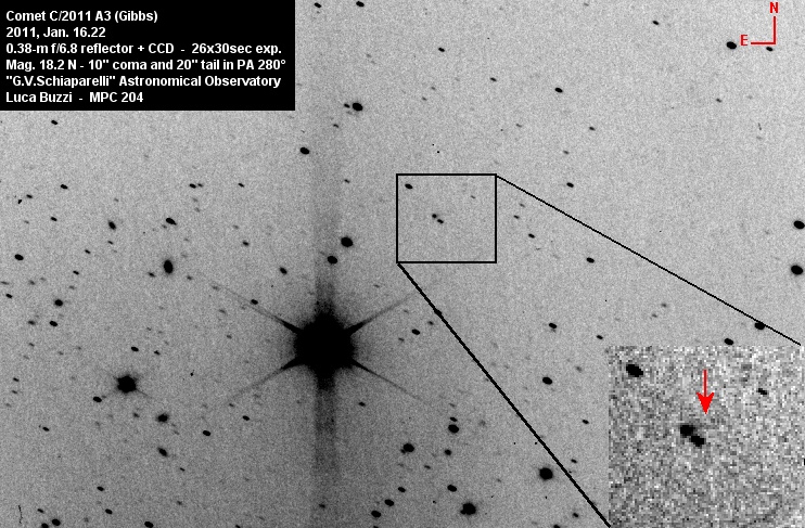 The sky was clear with good seeing so I could confirm its cometary feature: in the total stack (34 min of exposure time) the comet has a FWHM around 30% larger than stars nearby of similar brightness, with a 8″ compact coma elongated in PA around 250°.